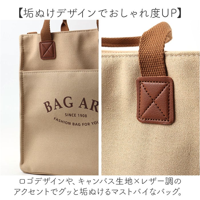 ・ロゴデザインや、キャンバス生地×レザー調のアクセントでグッと垢ぬけるマストバイなバッグ。