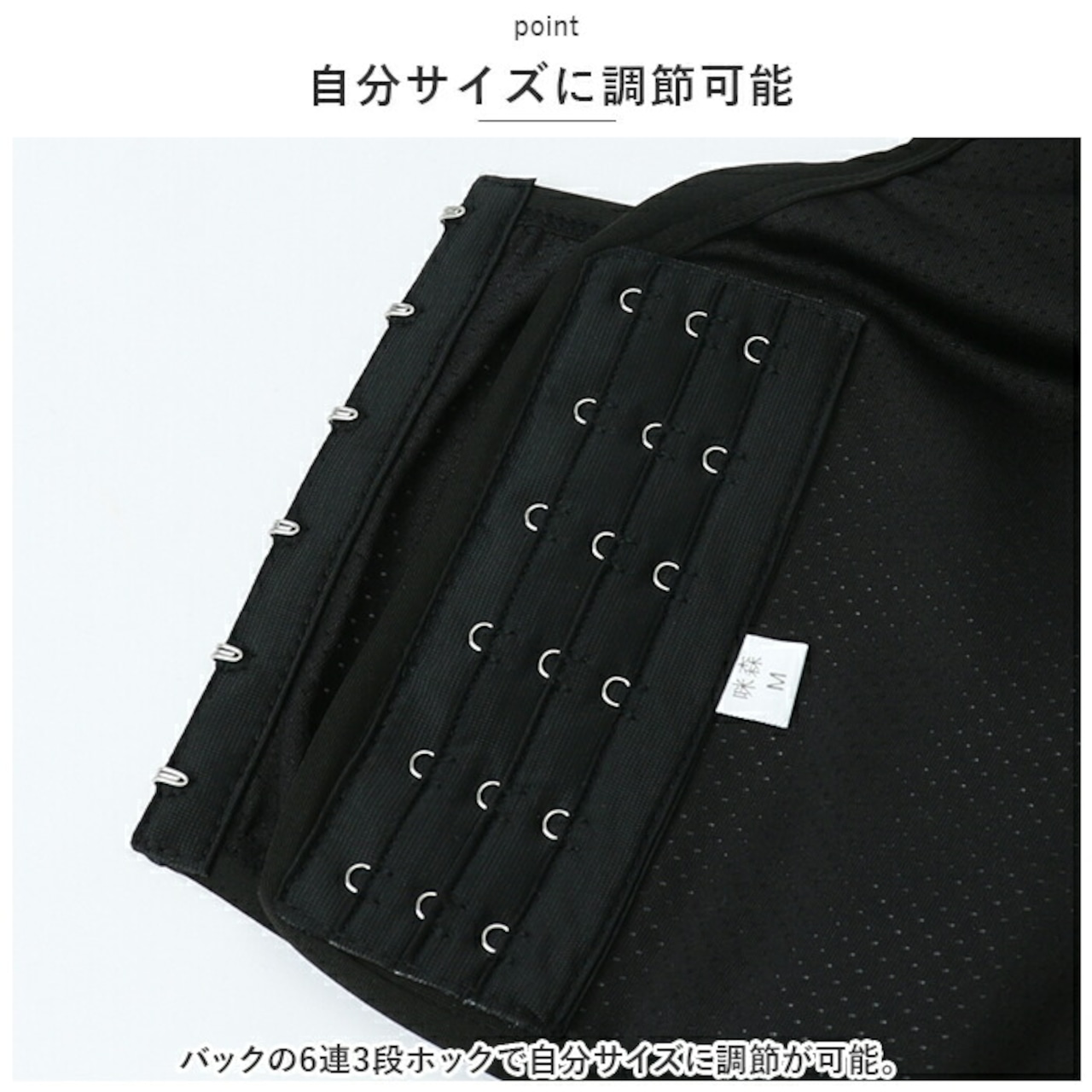 ・バックの6連3段ホックで自分サイズに調節が可能。