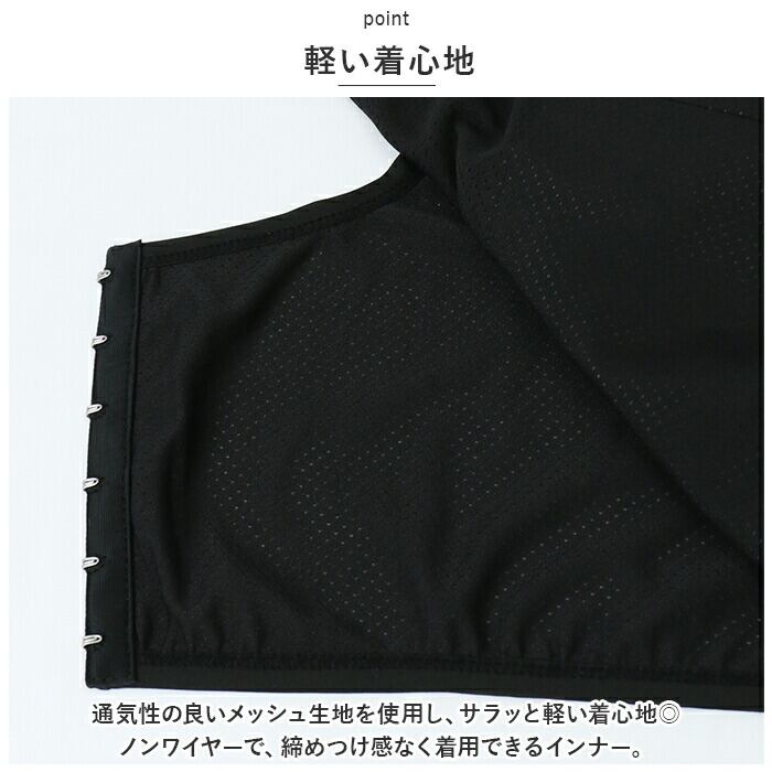 ・通気性の良いメッシュ生地を使用し、サラッと軽い着心地◎ノンワイヤーで、締めつけ感なく着用できるインナー。