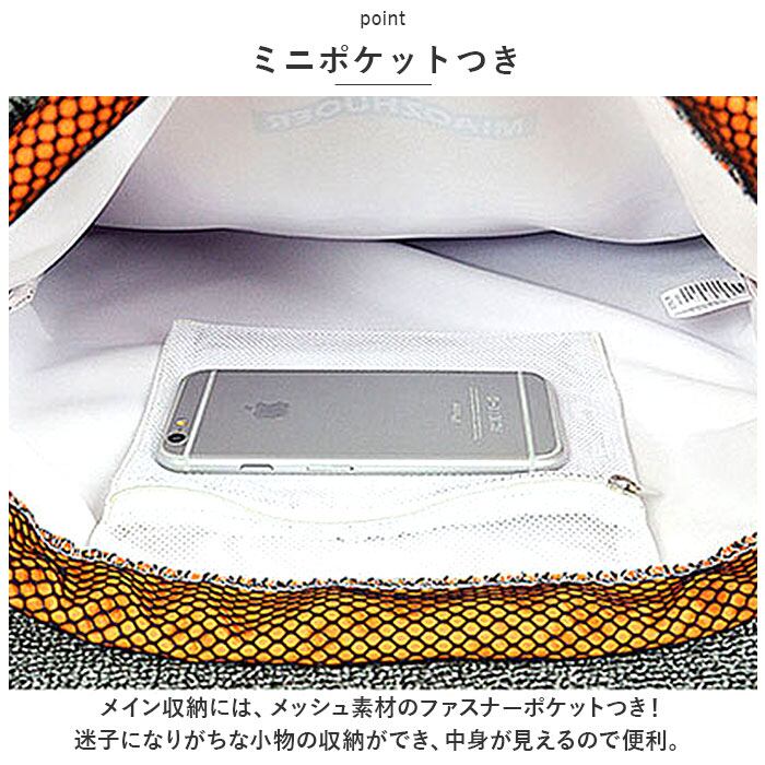 ・メイン収納には、メッシュ素材のファスナーポケットつき!迷子になりがちな小物の収納ができ、中身が見えるので便利。