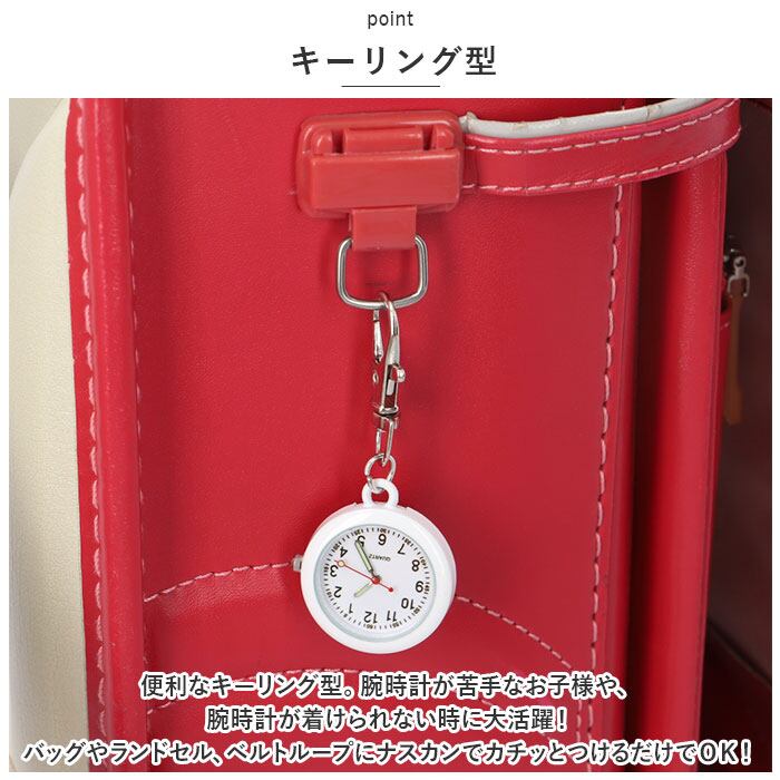 ・便利なキーリング型。腕時計が苦手なお子様や、腕時計が着けられない時に大活躍!バッグやランドセル、ベルトループにナスカンでカチッとつけるだけでOK!