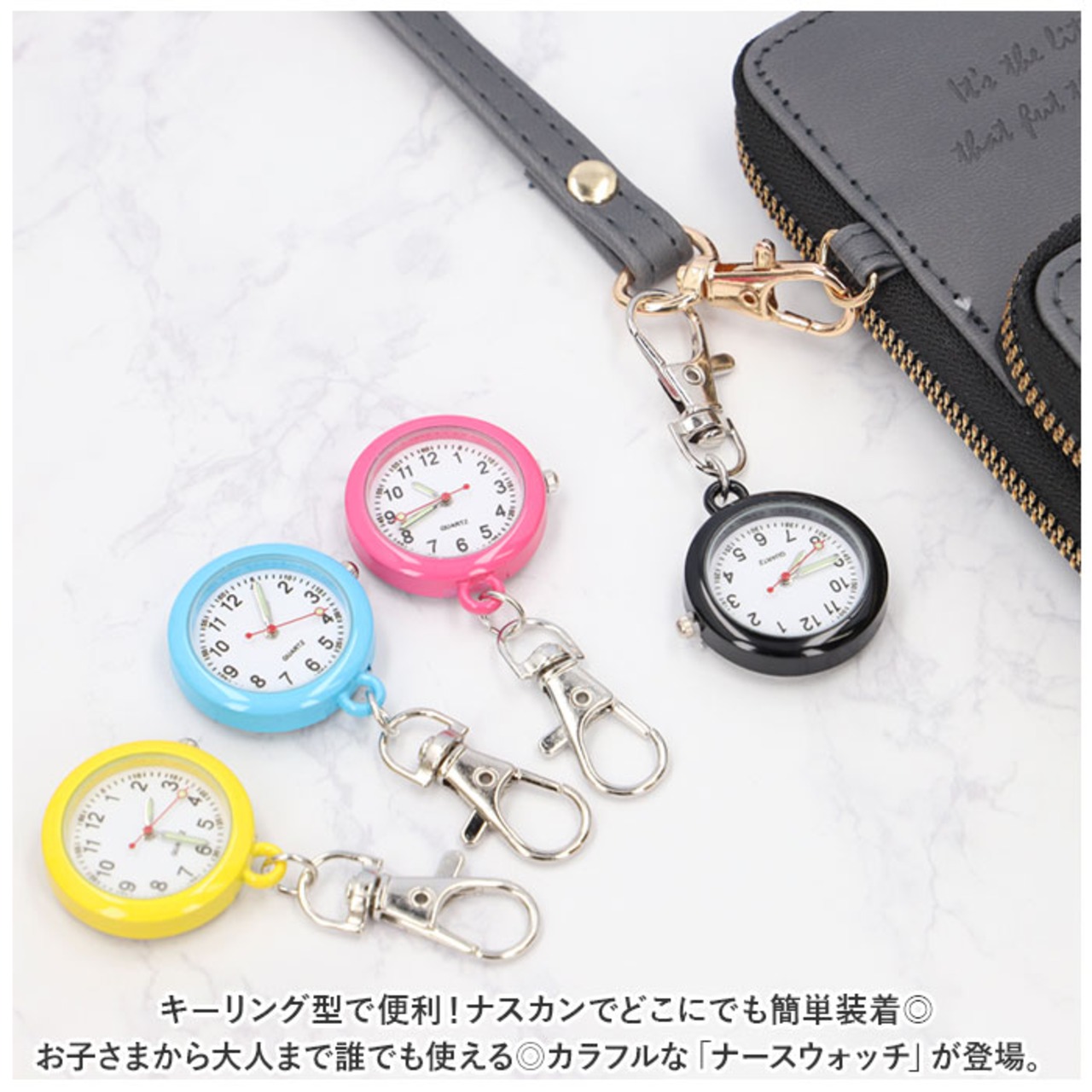 ・キーリング型で便利!ナスカンでどこにでも簡単装着◎お子さまから大人まで誰でも使える◎カラフルな「ナースウォッチ」が登場。