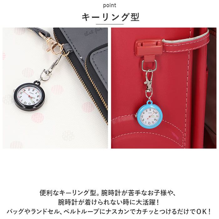・便利なキーリング型。腕時計が苦手なお子様や、腕時計が着けられない時に大活躍!バッグやランドセル、ベルトループにナスカンでカチッとつけるだけでOK!