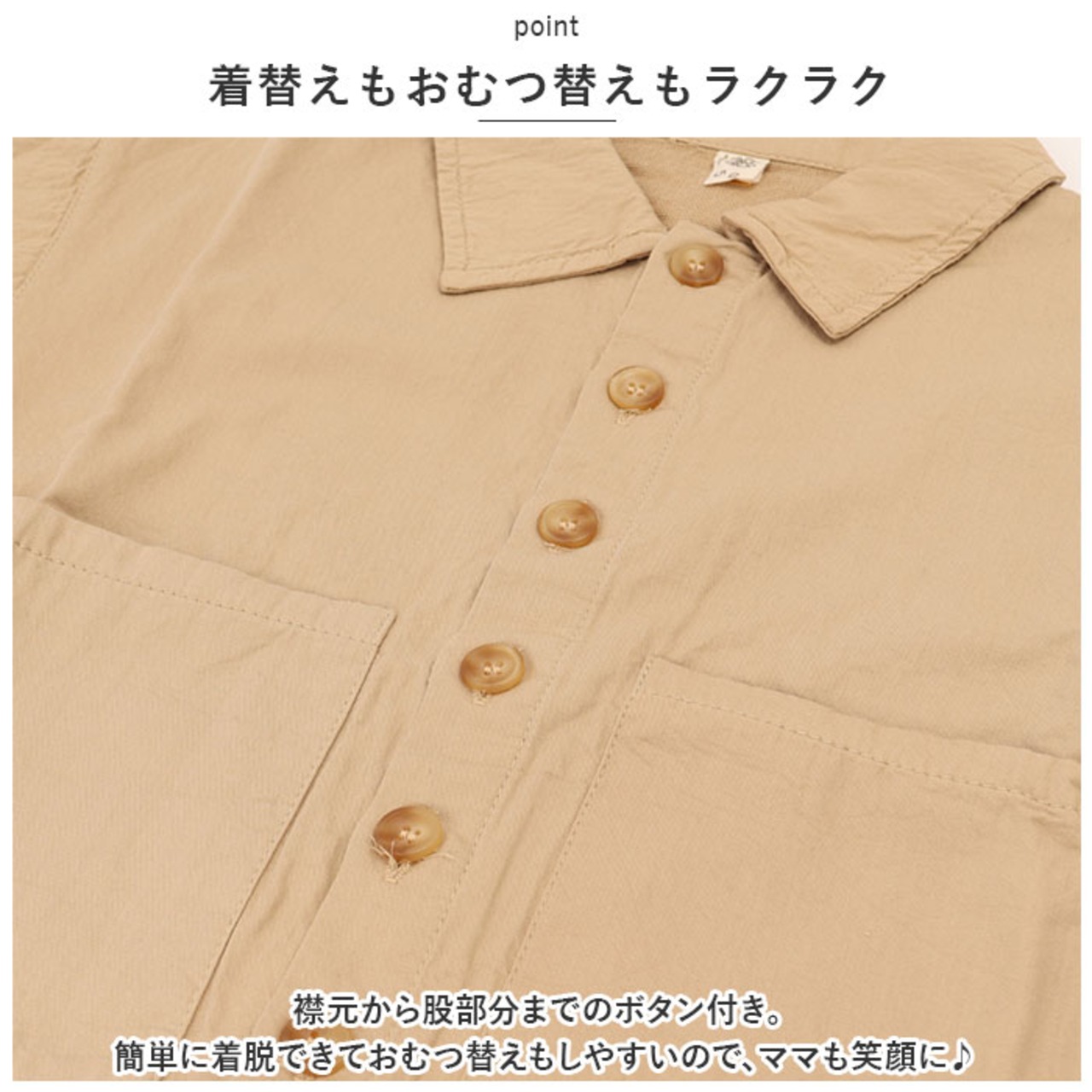 ・襟元から股部分までのボタン付き。簡単に着脱できておむつ替えもしやすいので、ママも笑顔に♪