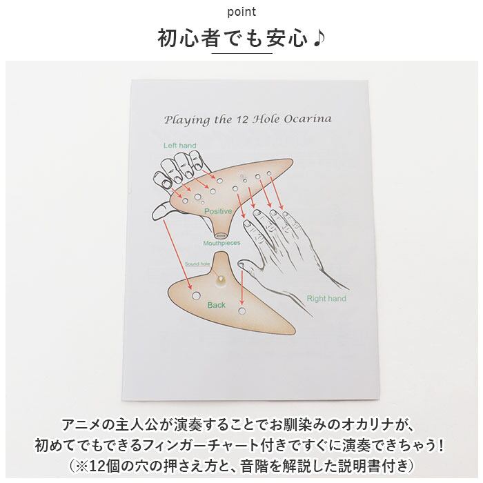 ・アニメの主人公が演奏することでお馴染みのオカリナが、初めてでもできるフィンガーチャート付きですぐに演奏できちゃう!(※12個の穴の押さえ方と、音階を解説した説明書付き)