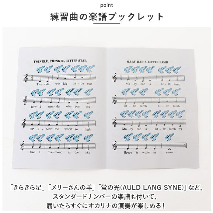 「きらきら星」「メリーさんの羊」「蛍の光(AULD LANG SYNE)」など、スタンダードナンバーの楽譜も付いて、届いたらすぐにオカリナの演奏が楽しめる!
