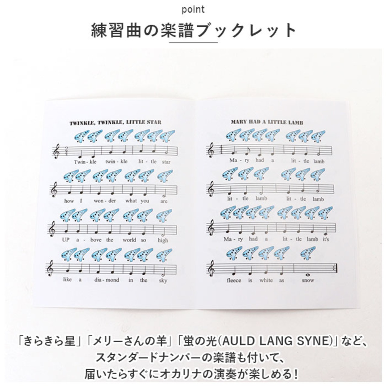 「きらきら星」「メリーさんの羊」「蛍の光(AULD LANG SYNE)」など、スタンダードナンバーの楽譜も付いて、届いたらすぐにオカリナの演奏が楽しめる!