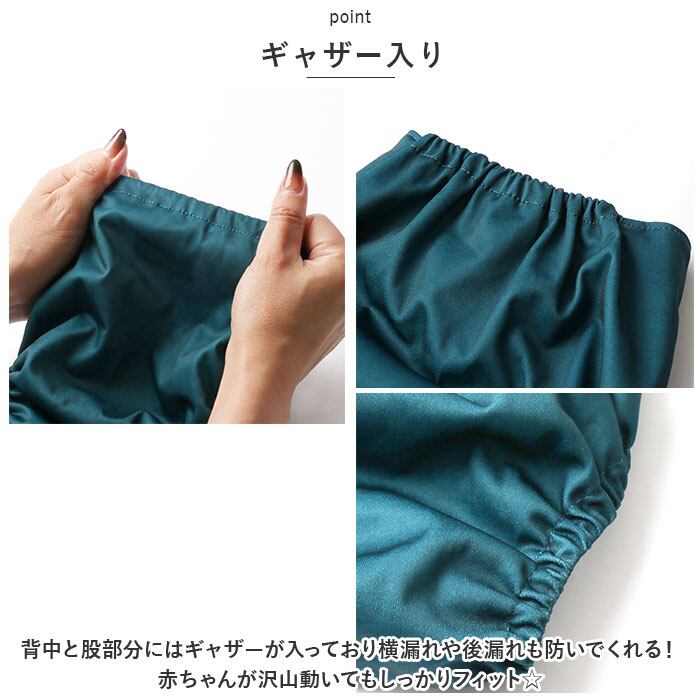 ・背中と股部分にはギャザーが入っており横漏れや後漏れも防いでくれる!赤ちゃんが沢山動いてもしっかりフィット☆