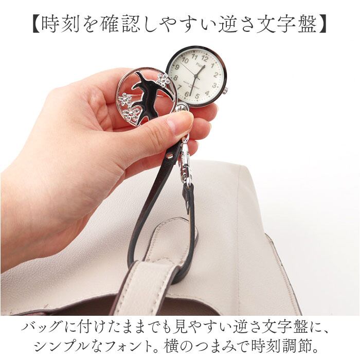 ・バッグに付けたままでも見やすい逆さ文字盤に、シンプルなフォント。横のつまみで時刻調節。