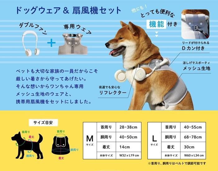 ・ペットも大切な家族の一員だからこそ暑さから守ってあげたい、熱中症にならないよう気を付けてあげたい。そんな想いからワンちゃん専用のウェアと携帯用扇風機がセットになりました。