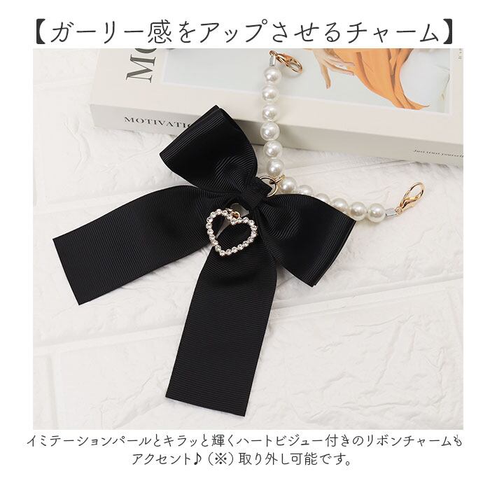 ・イミテーションパールとキラッと輝くハートビジュー付きのリボンチャームもアクセント♪