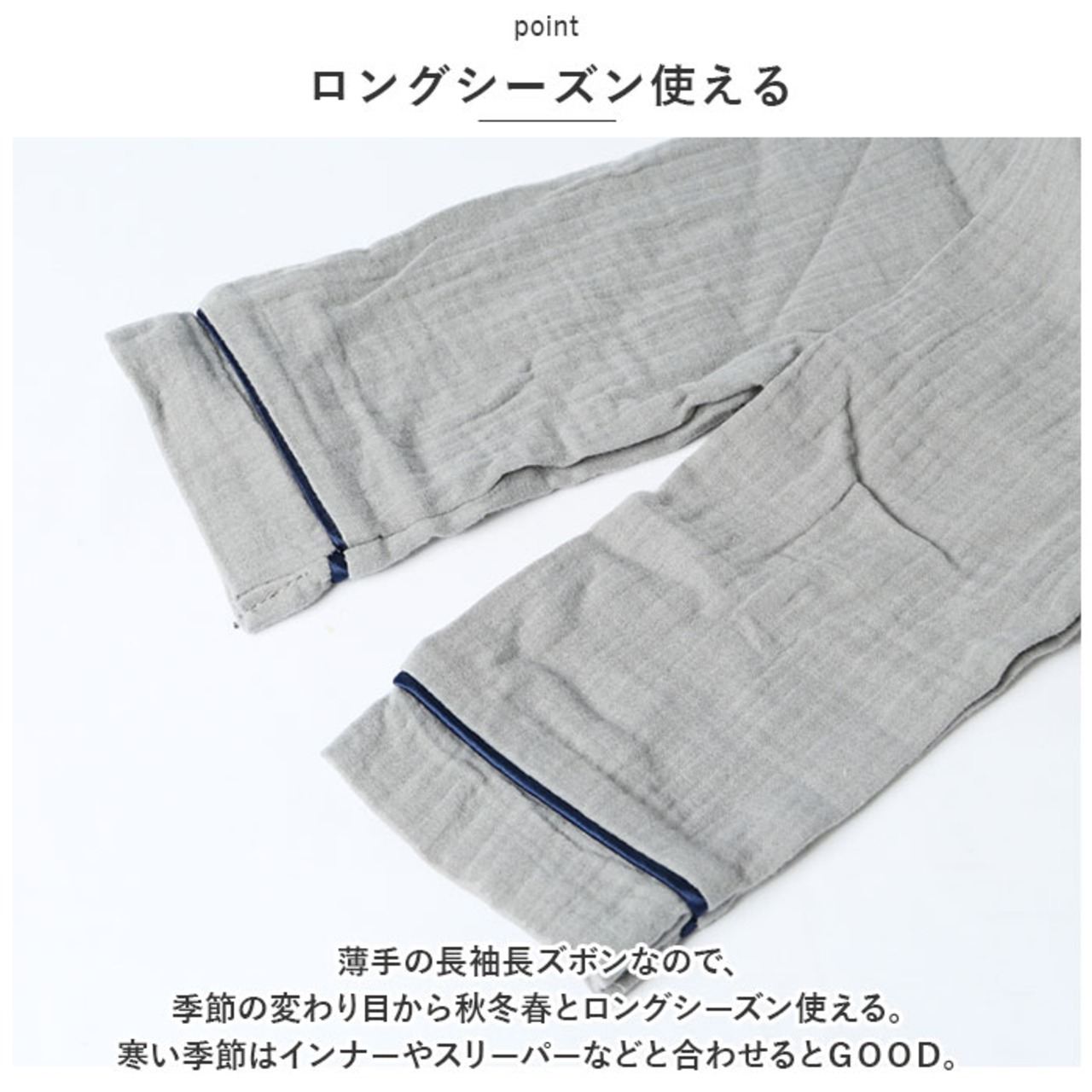 ・薄手の長袖長ズボンなので、季節の変わり目から秋冬春とロングシーズン使える。寒い季節はインナーやスリーパーなどと合わせるとGOOD。