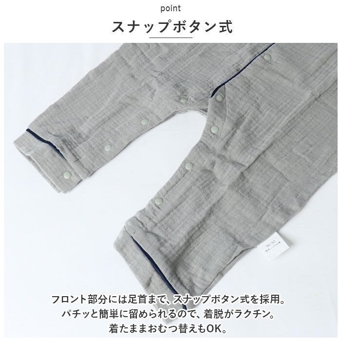 ・フロント部分には足首まで、スナップボタン式を採用。パチッと簡単に留められるので、着脱がラクチン。着たままおむつ替えもOK。