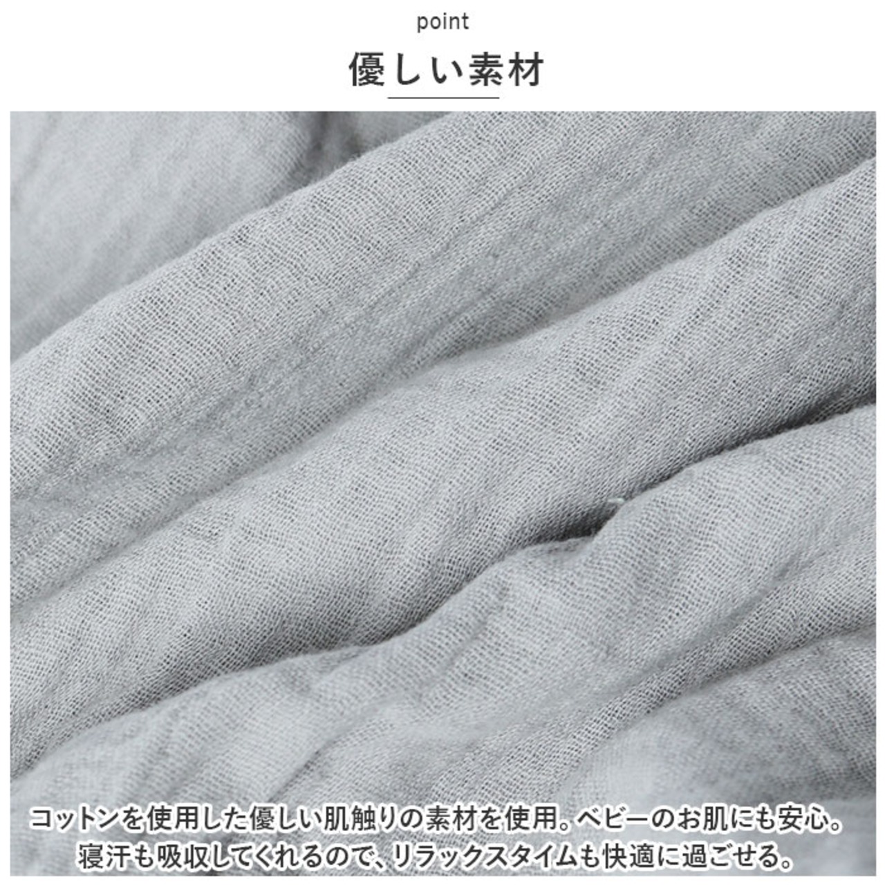 ・コットンを使用した優しい肌触りの素材を使用。ベビーのお肌にも安心。寝汗も吸収してくれるので、リラックスタイムも快適に過ごせる。