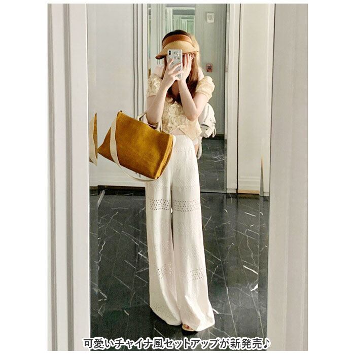 セットアップ レディース カジュアル 夏 通販 パンツスーツ スカラップパンツ レースパンツ スカラップレース レース ブラウス 半袖 パフスリーブ おしゃれ かわいい カジュアル きれいめ 夏 ロングパンツ ボトムス トップス レディースファッション