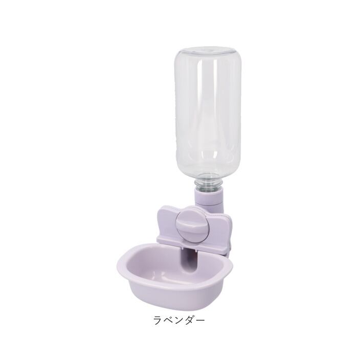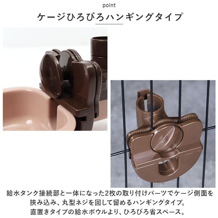 ・給水タンク接続部と一体になった2枚の取り付けパーツでケージ側面を挟み込み、丸型ネジを回して留めるハンギングタイプ。直置きタイプの給水ボウルより、ひろびろ省スペース。