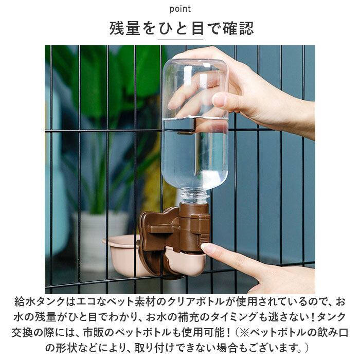 ・水飲みトレーにすぐに取り付けて使える容量500mlの給水タンクが付属。毎朝お出掛け前にタンクに水を補充したら、飼い主さんが帰宅するまでたっぷりお水が飲めるから安心!