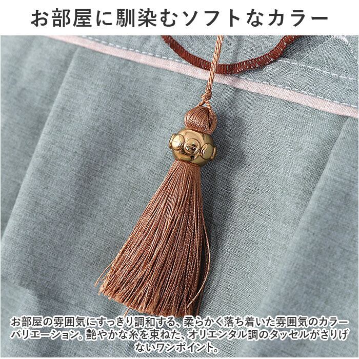 ・お部屋の雰囲気にすっきり調和する、柔らかく落ち着いた雰囲気のカラーバリエーション。艶やかな糸を束ねた、オリエンタル調のタッセルがさりげないワンポイント。