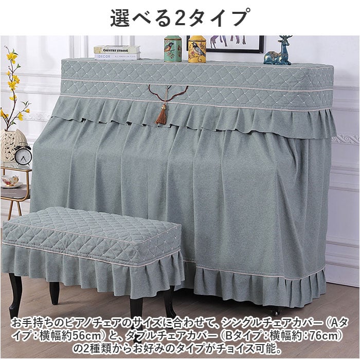 ・お手持ちのピアノチェアのサイズに合わせて、シングルチェアカバー(Aタイプ:横幅約56cm)と、ダブルチェアカバー(Bタイプ:横幅約:76cm)の2種類からお好みのタイプがチョイス可能。