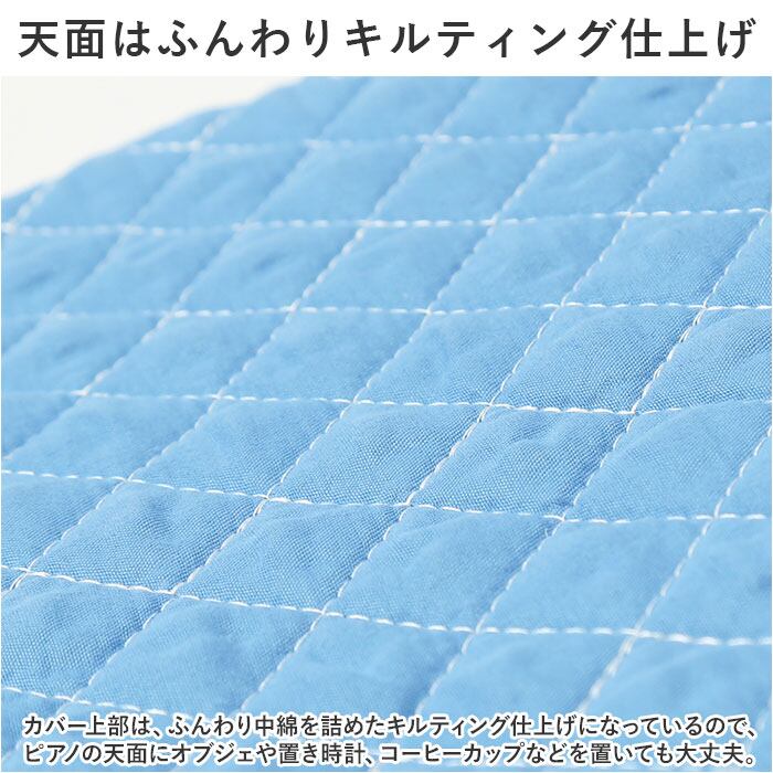 ・カバー上部は、ふんわり中綿を詰めたキルティング仕上げになっているので、ピアノの天面にオブジェや置き時計、コーヒーカップなどを置いても大丈夫。