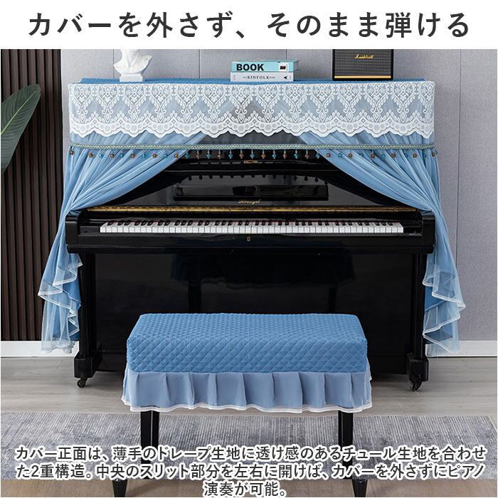 ・カバー正面は、薄手のドレープ生地に透け感のあるチュール生地を合わせた2重構造。中央のスリット部分を左右に開けば、カバーを外さずにピアノ演奏が可能。