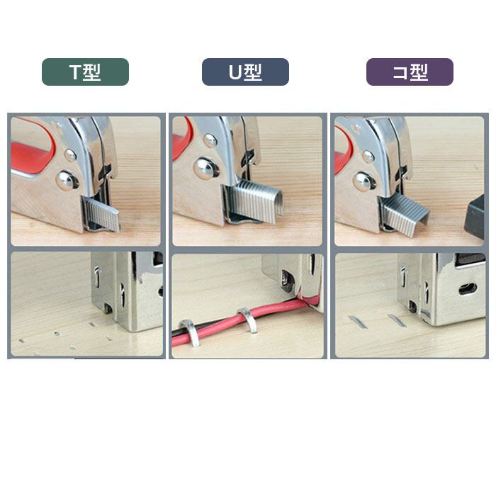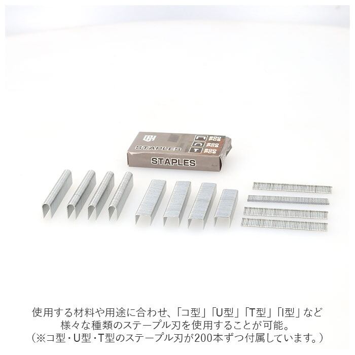 ・使用する材料や用途に合わせ、「コ型」「U型」「T型」「I型」など様々な種類のステープル刃を使用することが可能。(※コ型・U型・T型のステープル刃が200本ずつ付属しています。)