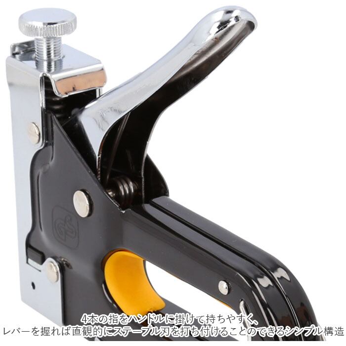 4本の指をハンドルに掛けて持ちやすく、レバーを握れば直観的にステープル刃を打ち付けることのできるシンプル構造。