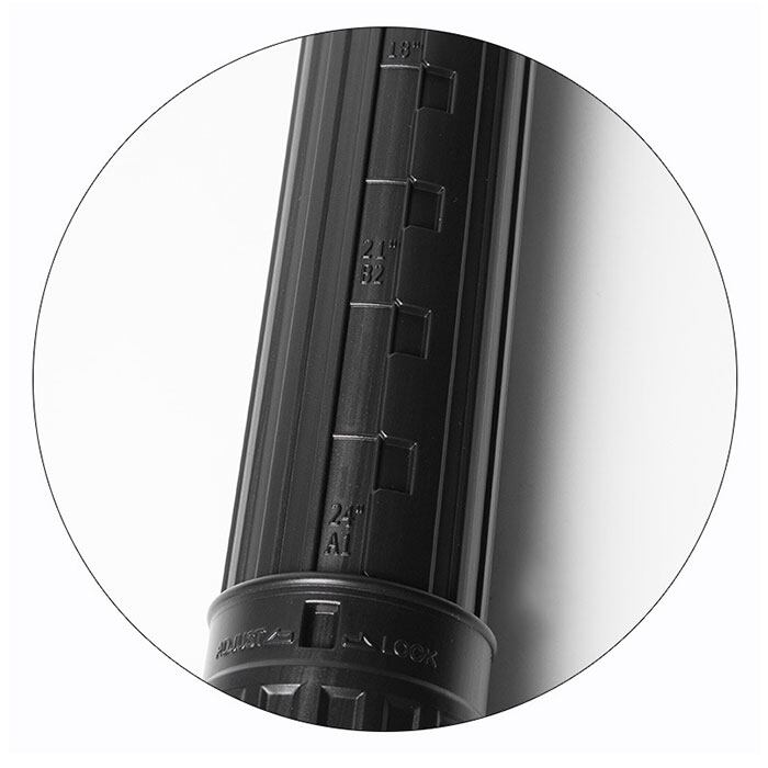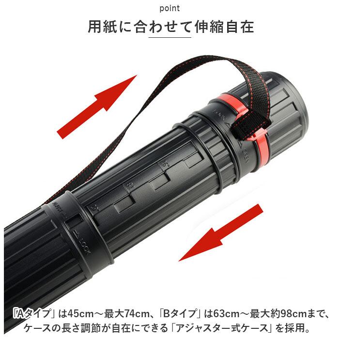 ・「Aタイプ」は45cm-最大74cm、「Bタイプ」は63cm-最大約98cmまで、ケースの長さ調節が自在にできる「アジャスター式ケース」を採用。