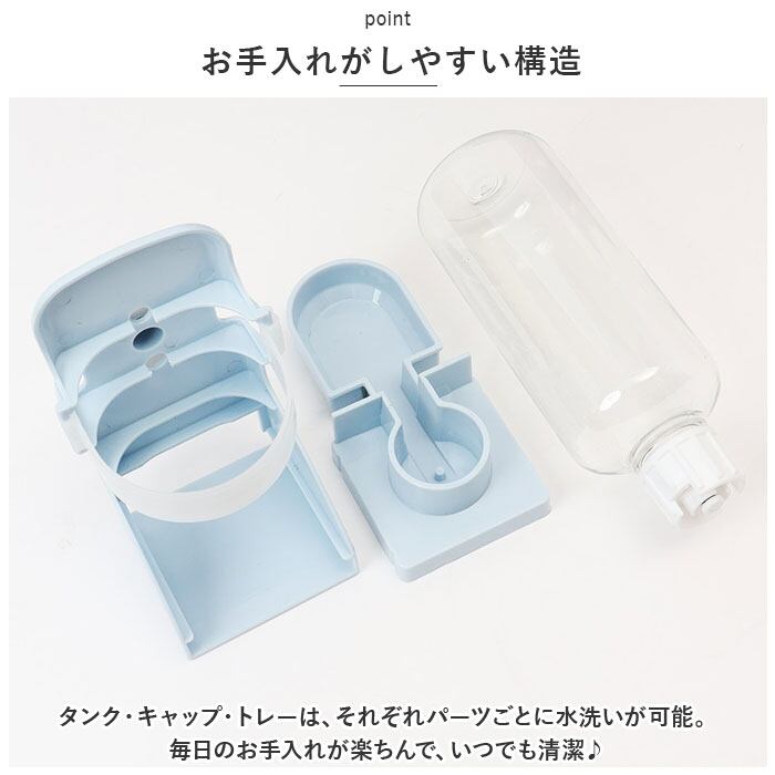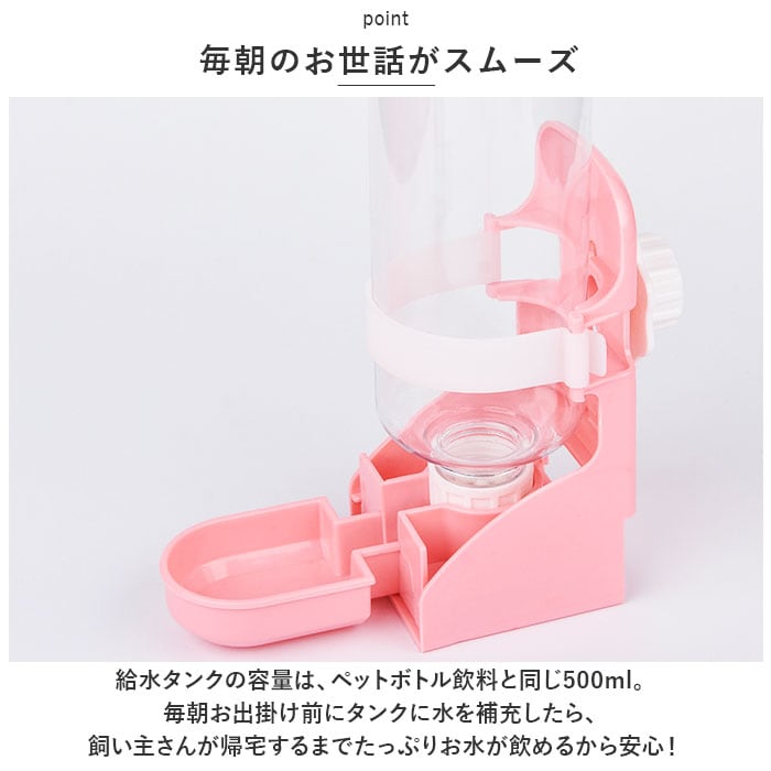 ・給水タンクの容量は、ペットボトル飲料と同じ500ml。毎朝お出掛け前にタンクに水を補充したら、飼い主さんが帰宅するまでたっぷりお水が飲めるから安心!