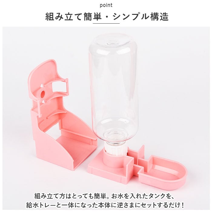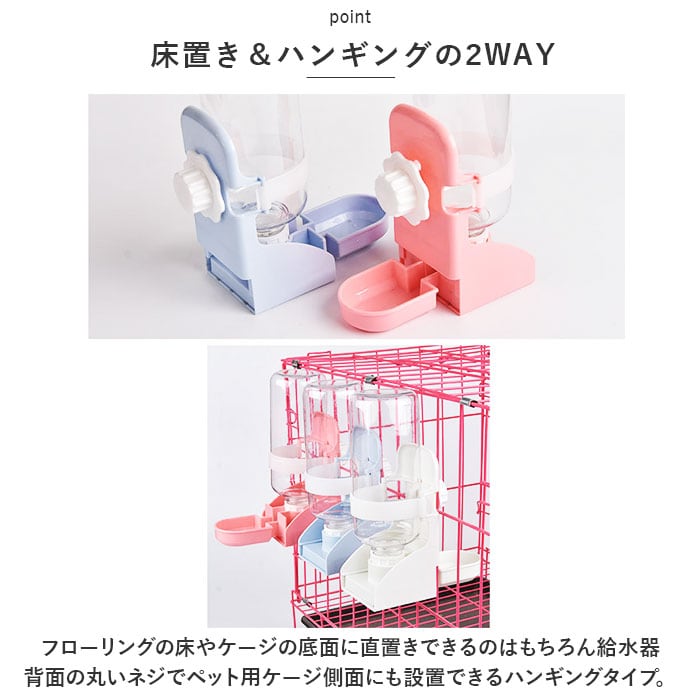 ・フローリングの床やケージの底面に直置きできるのはもちろん、給水器背面の丸いネジでペット用ケージ側面にも設置できるハンギングタイプ。
