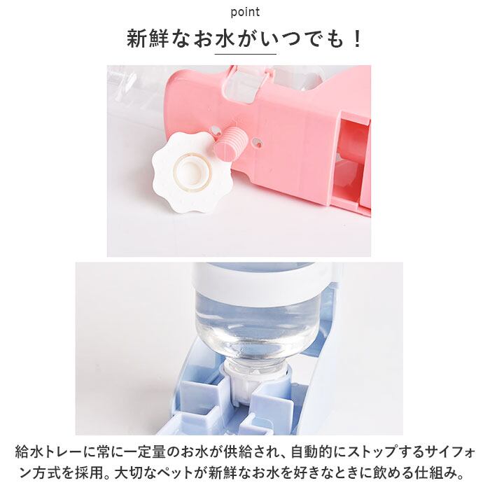 ・給水トレーに常に一定量のお水が供給され、自動的にストップするサイフォン方式を採用。大切なペットが新鮮なお水を好きなときに飲める仕組み。