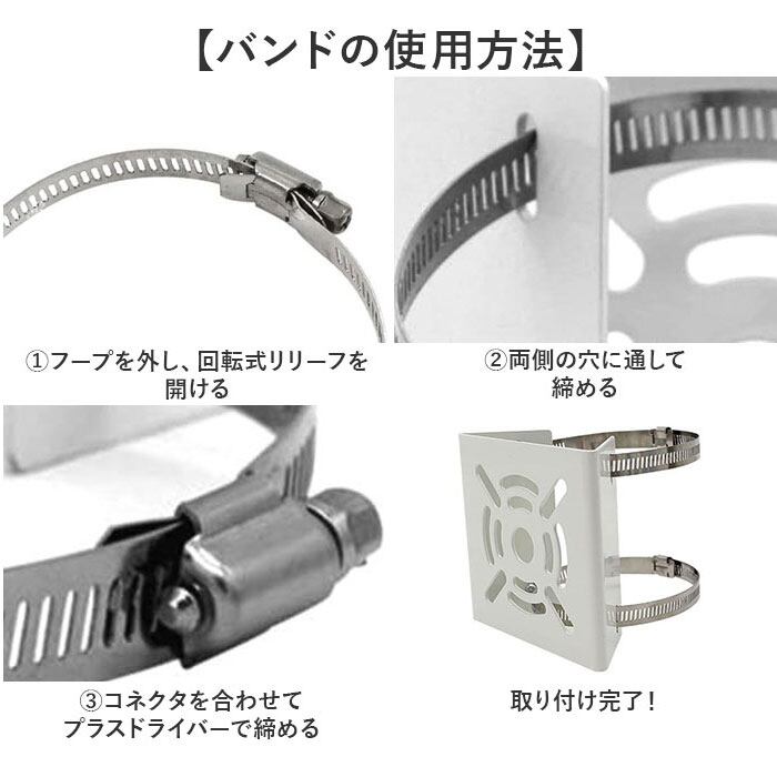 ・特殊な工具は必要なく、ドライバー1本で設置。取り付けもバンドを通して締めるだけ◎