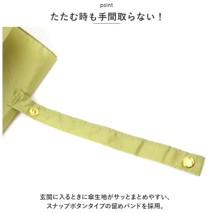 ・玄関に入るときに傘生地がサッとまとめやすい、スナップボタンタイプの留めバンドを採用。