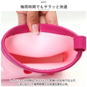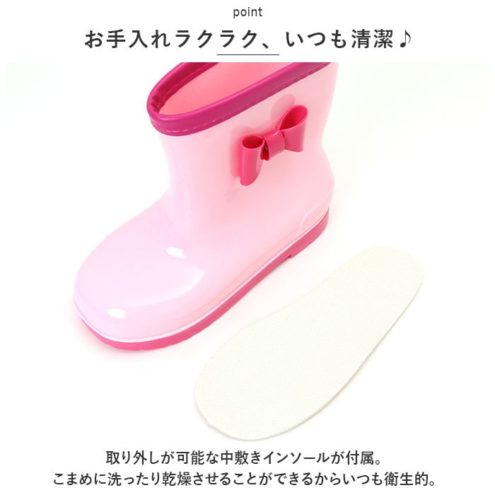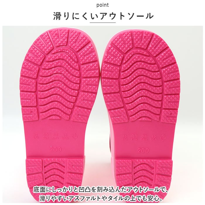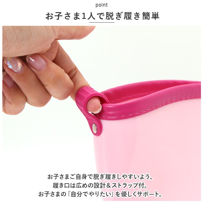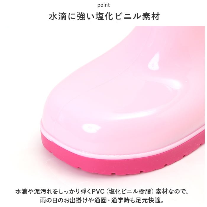 ・水滴や泥汚れをしっかり弾くPVC(塩化ビニル樹脂)素材なので、雨の日のお出掛けや通園・通学時も足元快適。
