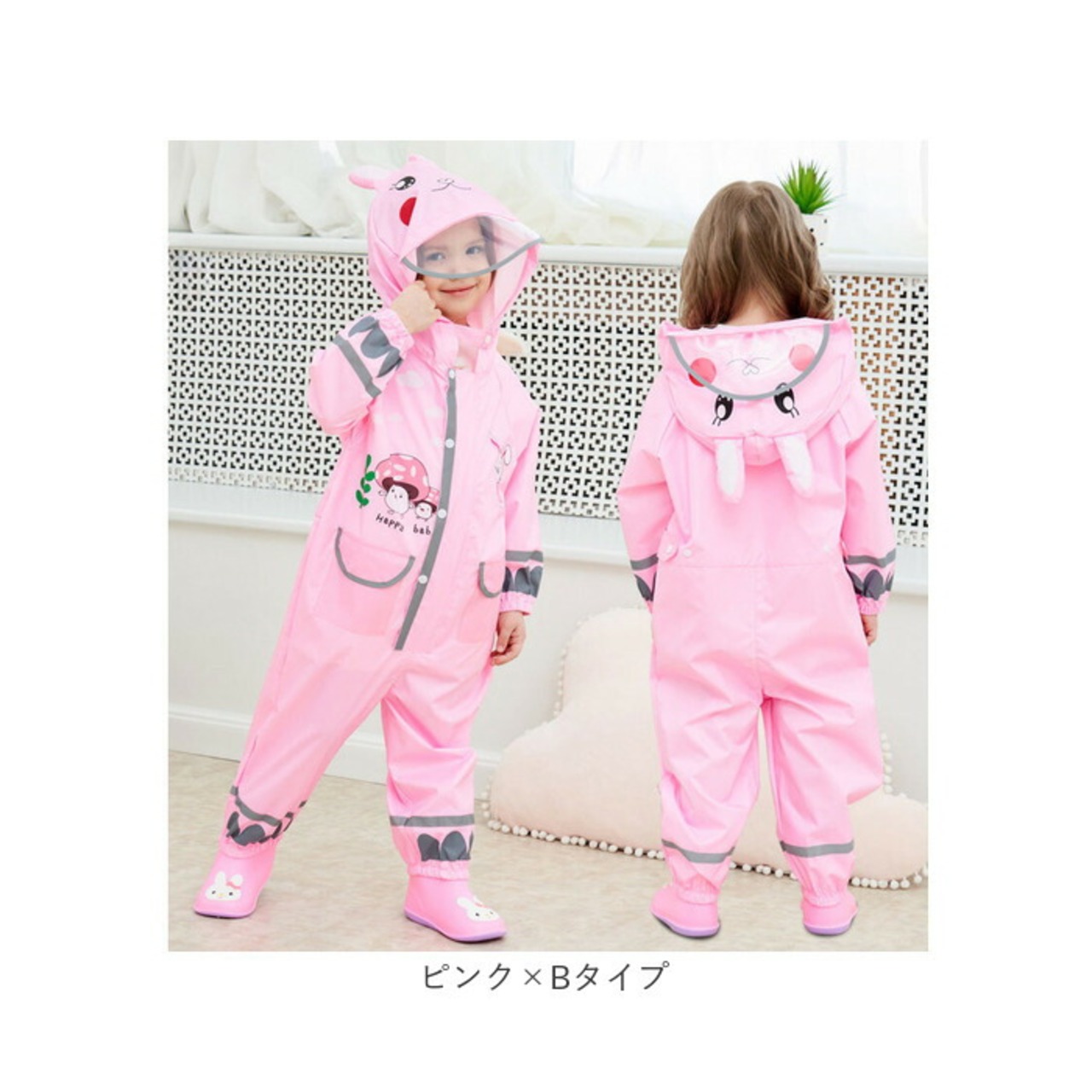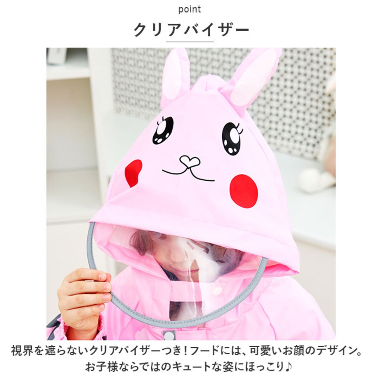 ・視界を遮らないクリアバイザーつき!フードには、可愛いお顔のデザイン。お子様ならではのキュートな姿にほっこり♪