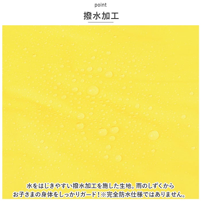 ・水をはじきやすい撥水加工を施した生地。雨のしずくからお子さまの身体をしっかりガード!※完全防水仕様ではありません。