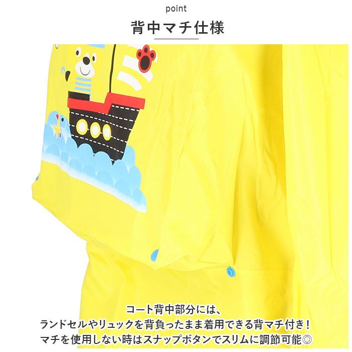 ・コート背中部分には、ランドセルやリュックを背負ったまま着用できる背マチ付き!マチを使用しない時はスナップボタンでスリムに調節可能◎
