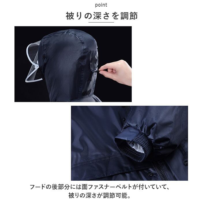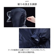 ・フードの後部分には面ファスナーベルトが付いていて、被りの深さが調節可能。
