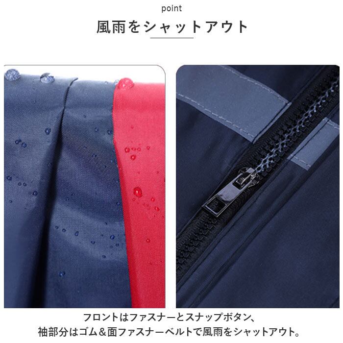 ・フロントはファスナーとスナップボタン、袖部分はゴム&面ファスナーベルトで風雨をシャットアウト。