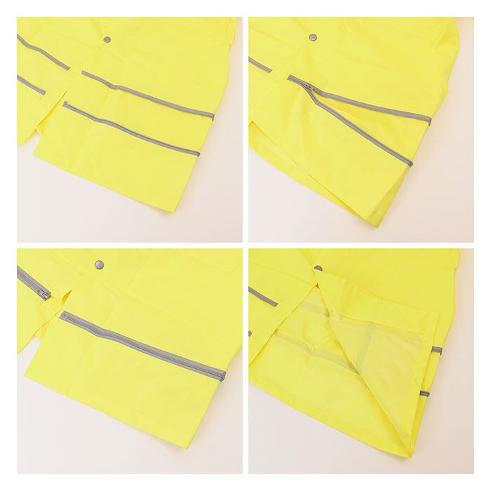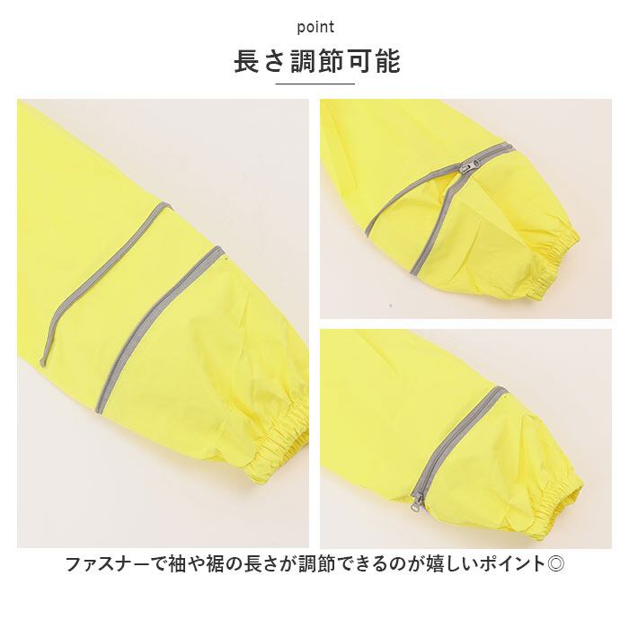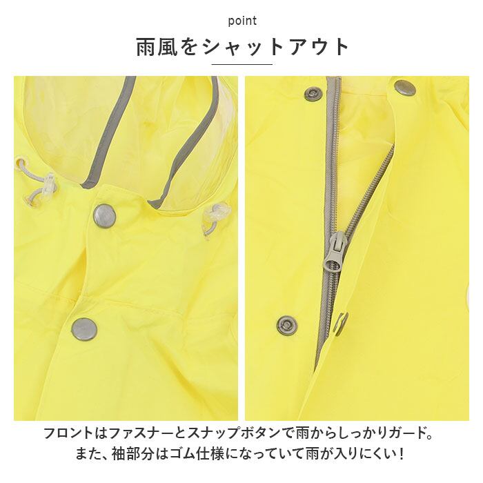 ・フロントはファスナーとスナップボタンで雨からしっかりガード。また、袖部分はゴム仕様になっていて雨が入りにくい!