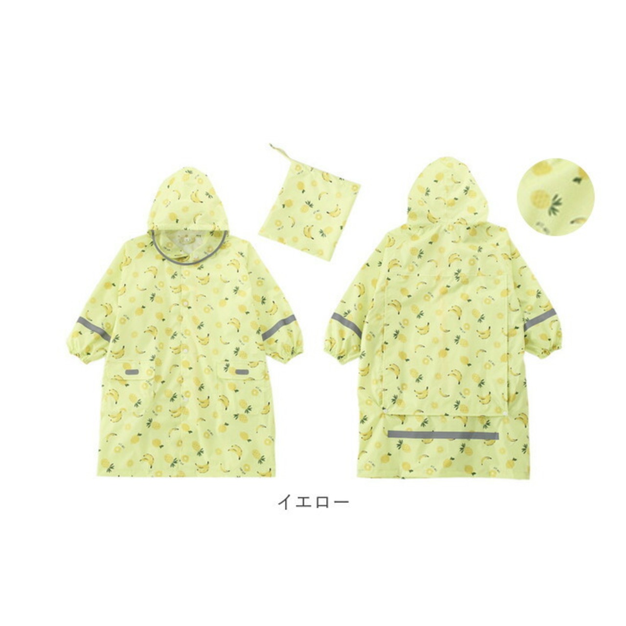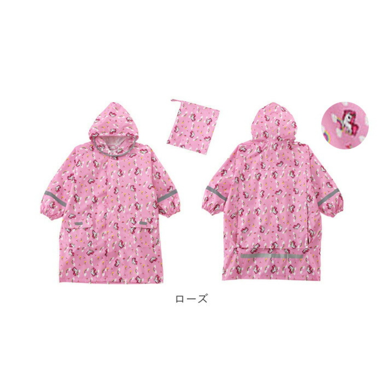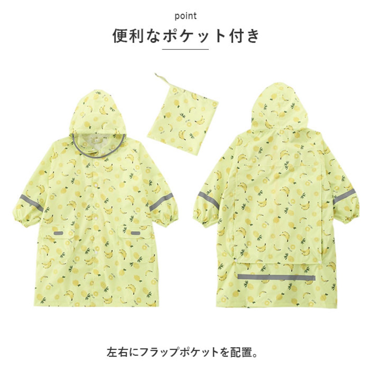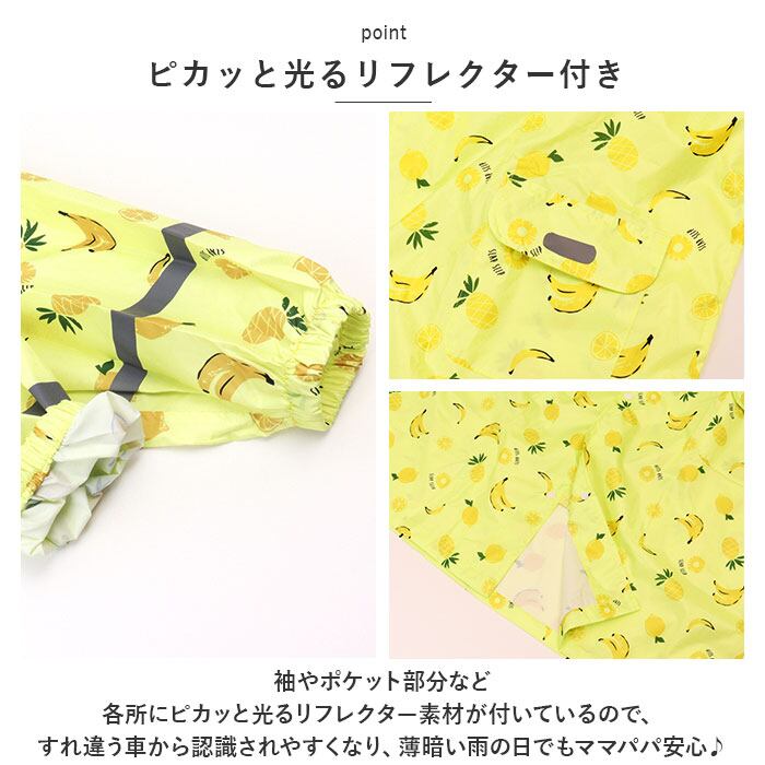 ・袖やポケット部分など各所にピカッと光るリフレクター素材が付いているので、すれ違う車から認識されやすくなり、薄暗い雨の日でもママパパ安心♪