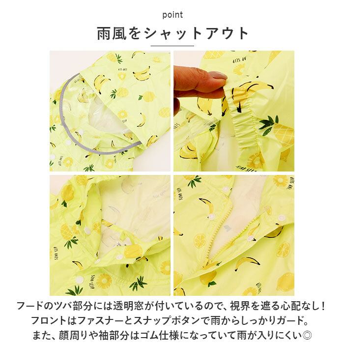 ・フロントはファスナーとスナップボタンで雨からしっかりガード。また、顔周りや袖部分はゴム仕様になっていて雨が入りにくい◎