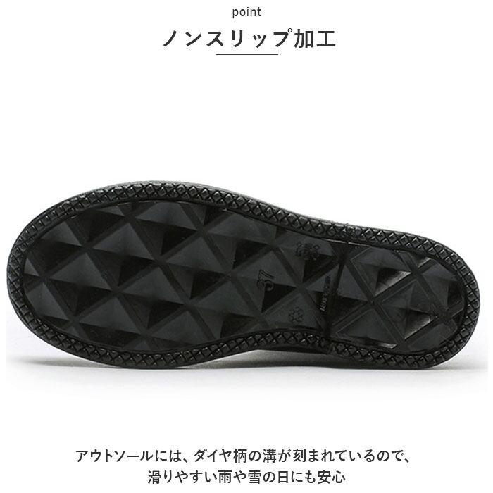 ・アウトソールには、ダイヤ柄の溝が刻まれているので、滑りやすい雨や雪の日にも安心。
