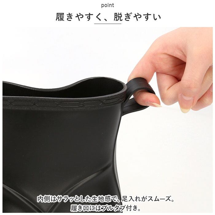・内側はサラッとした生地感で、足入れがスムーズ。履き口にはプルタブ付き。