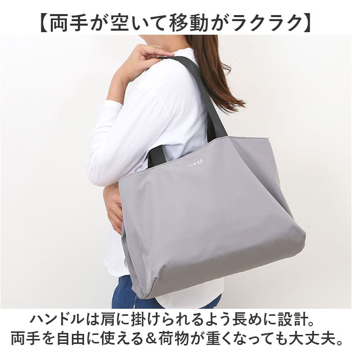 ・ハンドルは肩に掛けられるよう長めに設計。両手を自由に使える&荷物が重くなっても大丈夫。