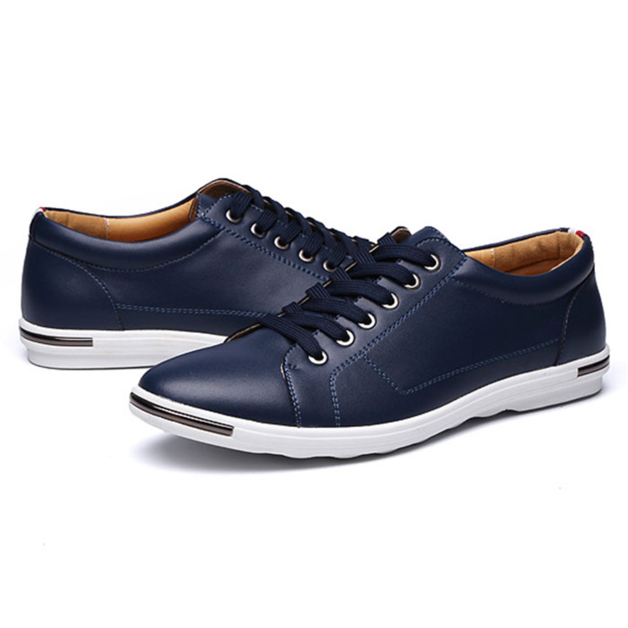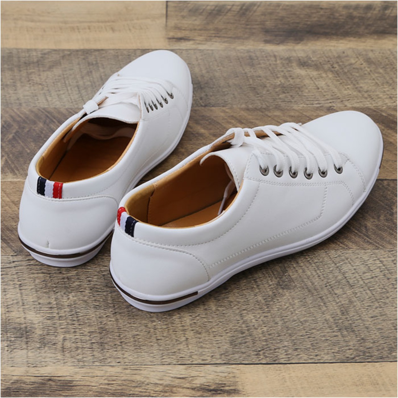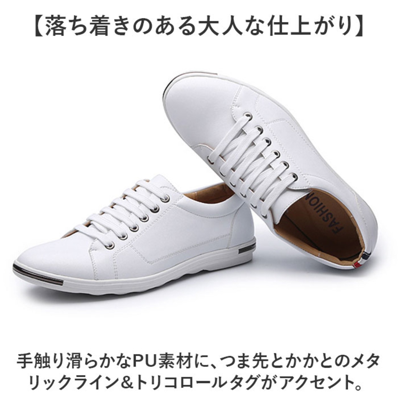 ・手触り滑らかなPU素材に、つま先とかかとのメタリックライン&トリコロールタグがアクセント。