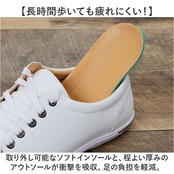 ・取り外し可能なソフトインソールと、程よい厚みのアウトソールが衝撃を吸収。足の負担を軽減。