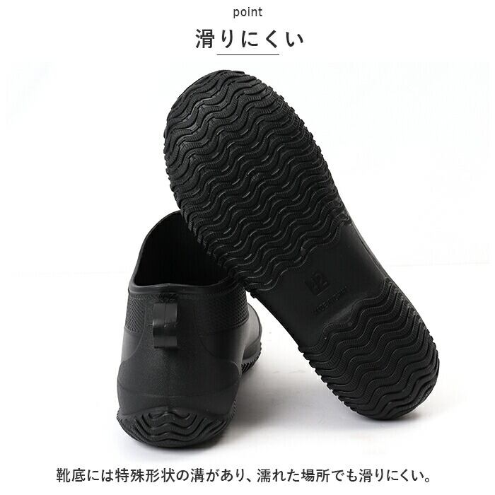 ・靴底には特殊形状の溝があり、濡れた場所でも滑りにくい。
