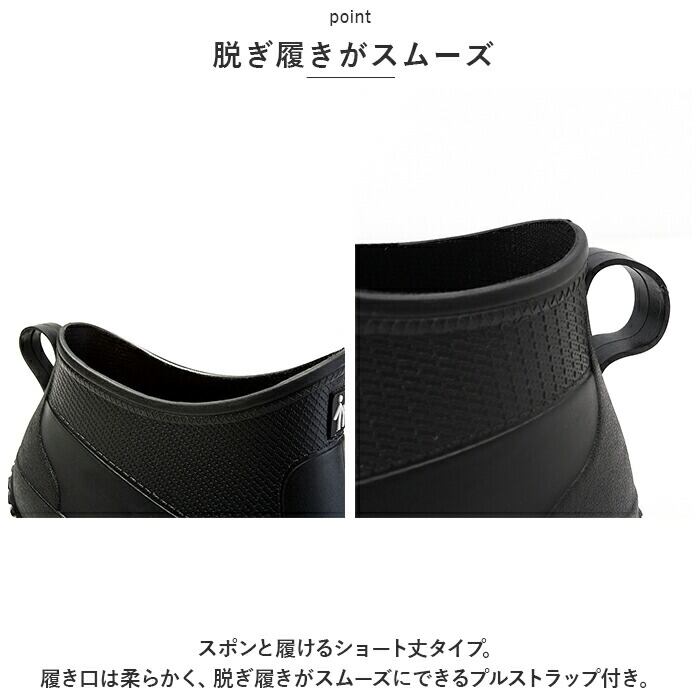 ・スポンと履けるショート丈タイプ。履き口は柔らかく、脱ぎ履きがスムーズにできるプルストラップ付き。