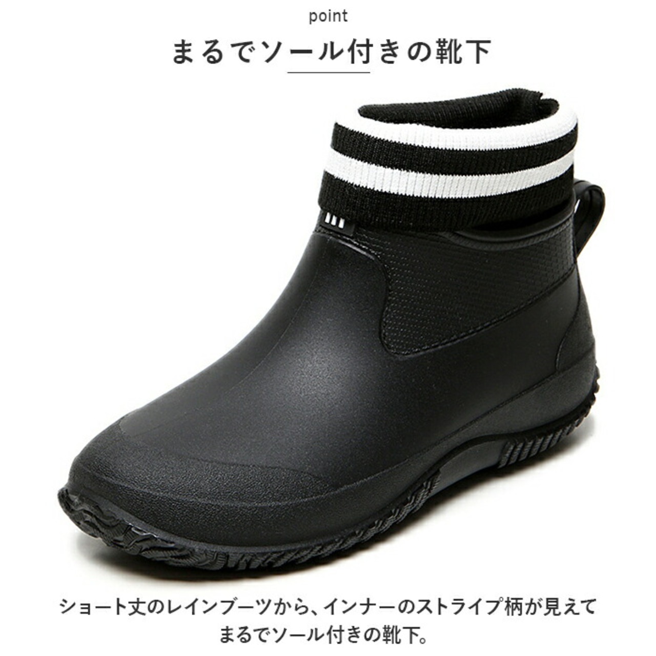 ・ショート丈のレインブーツから、インナーのストライプ柄が見えてまるでソール付きの靴下。